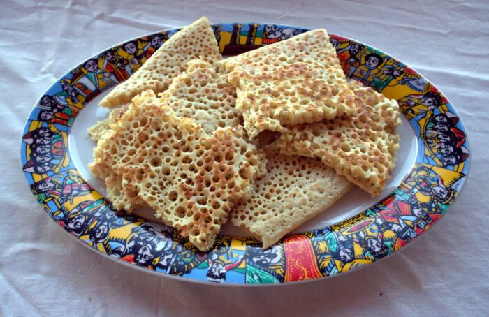 This type of bread has a spongy texture and a slightly sour taste. Injera bread contains tiny grains called teff, which come from Ethiopia. This bread is used to scoop up the meats and stews that are essential parts of the Ethiopian diet.