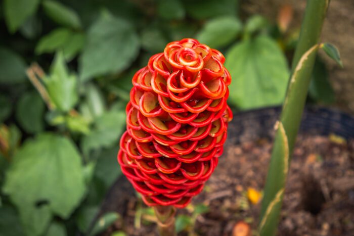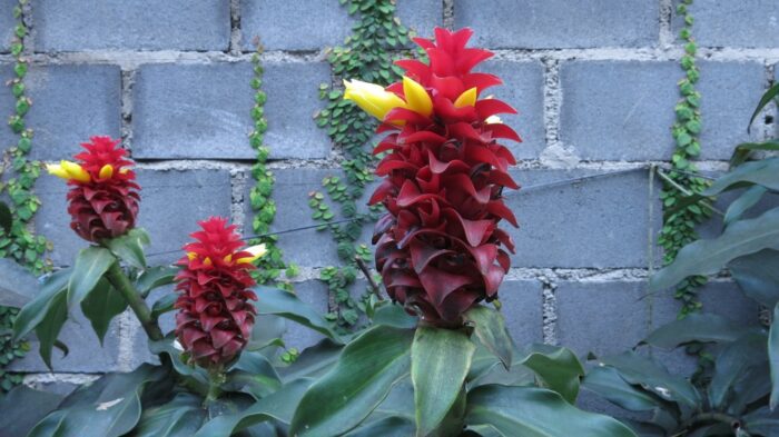 This is another tropical flowering plant that forms a beehive-like cone shape, but it flowers much higher up the plant than beehive ginger. Costus features small yellow or pink flowers that emerge from the petals of the red cone. These flowers are edible and have a sweet taste. They are perfect for decorating a summer salad.