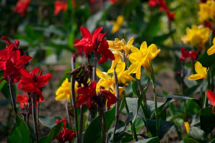 The canna is a great choice for gardens because they are readily available and grow rapidly. These tropical flowering plants will grow tall and prefer moist environments. Sunshine, combined with compost, will make them thrive. Beautiful pops of red, orange, and gold flowers are a lovely addition to any garden.