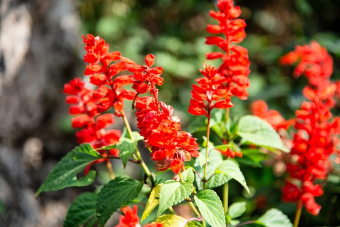 Salvia Splendens is a low-maintenance herbaceous plant originally from Brazil. It is commonly grown as an annual due to its prolific and vibrant flowering period from June until the first frost. The flowers attract butterflies and hummingbirds.