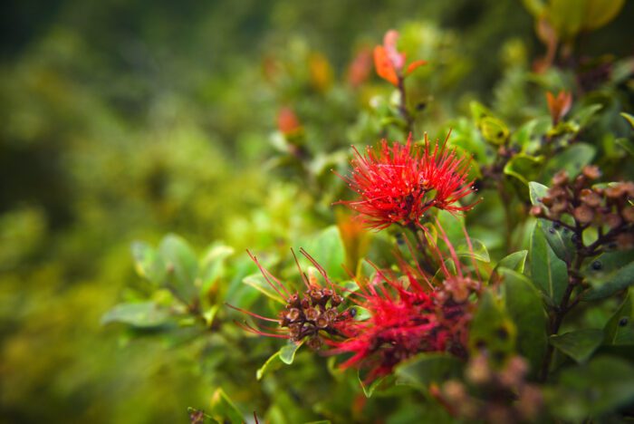 Ohia lehua is one of the most common native trees on the Hawaiian Islands and is a focal point of Hawaiian mythology. Its flowers are bright red and look like pom-poms. They can also be pink, orange, orange-red, salmon, or yellow.