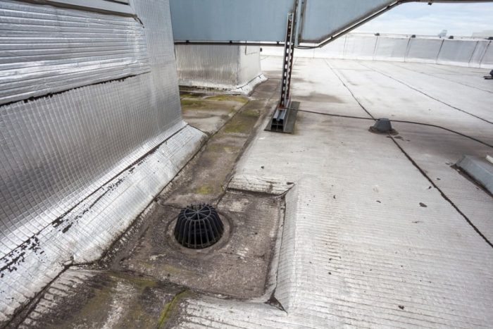 A flat roof slopes towards the installed drains, which carry rainwater to the ground.